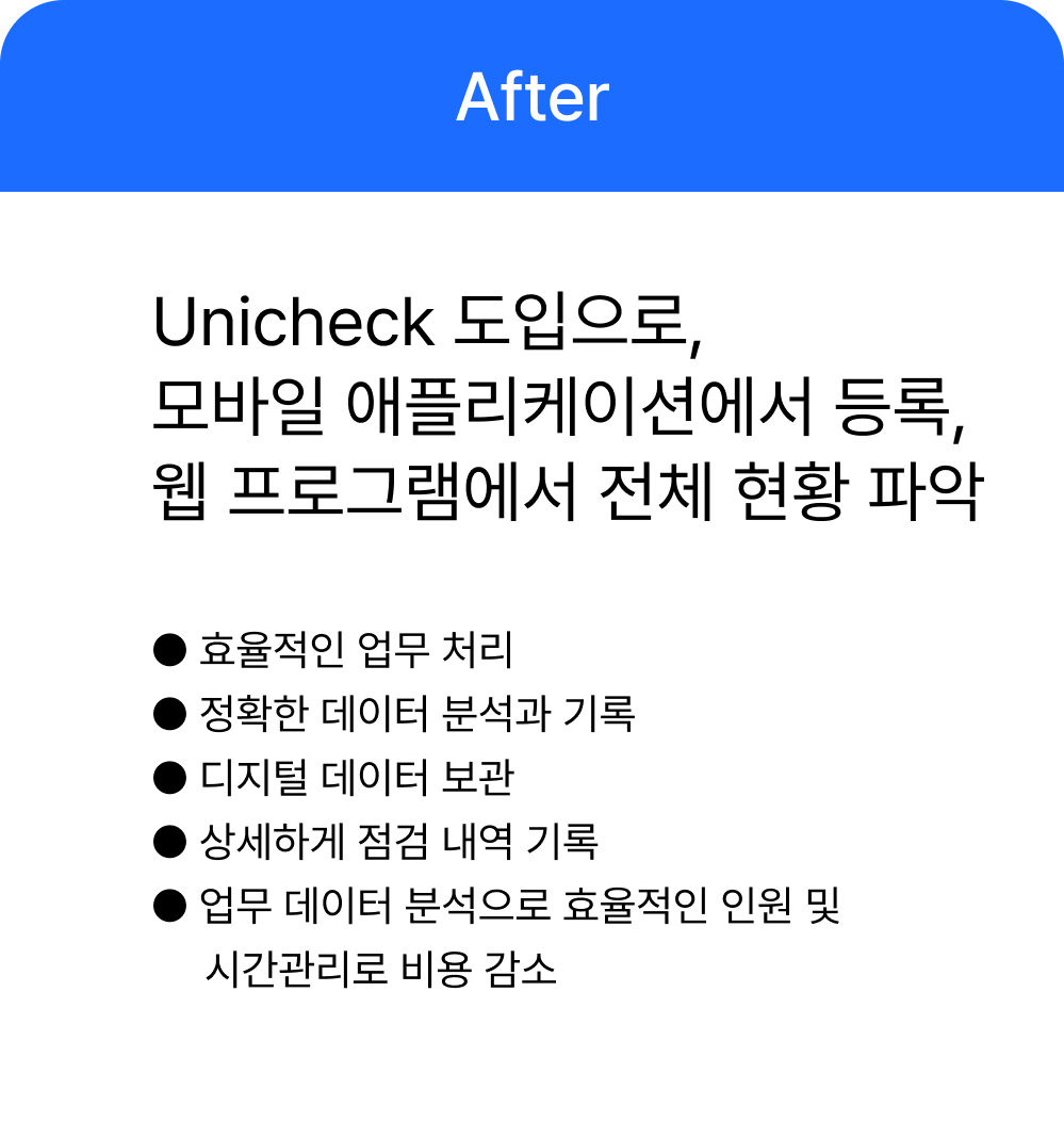 시설관리, 안전점검 업무 혁신을 통하여 관계자에게 보다 나은 업무 환경을 제공합니다. 유니체크는 시설관리와 점검 업무 모든 분야에서 시작하는 경험을 혁신하여 관리자, 점검자, 이용자 모두를 만족하는 환경을 만듭니다.